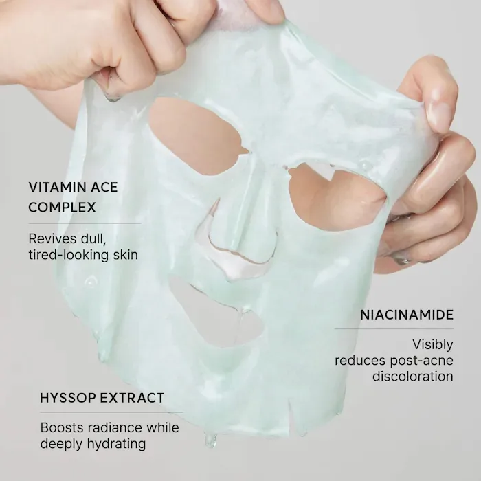 Qué es: Una mascarilla que aumenta la luminosidad con complejo de vitamina ACE, semillas de lino e hisopo francés para tratar las marcas posteriores al acné y mejorar visiblemente el tono desigual de la piel. Tamaño: 27 mL