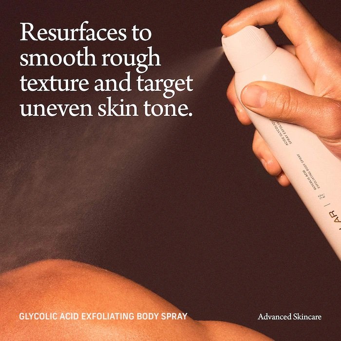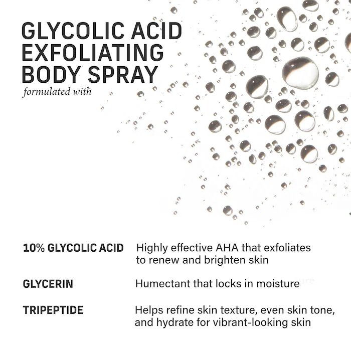 Qué es: Una bruma corporal con ácido glicólico al 10 por ciento que suaviza la textura áspera y trata el tono desigual de la piel, en una botella rociadora continua de 360° fácil de usar.Tamaño: 177 mL