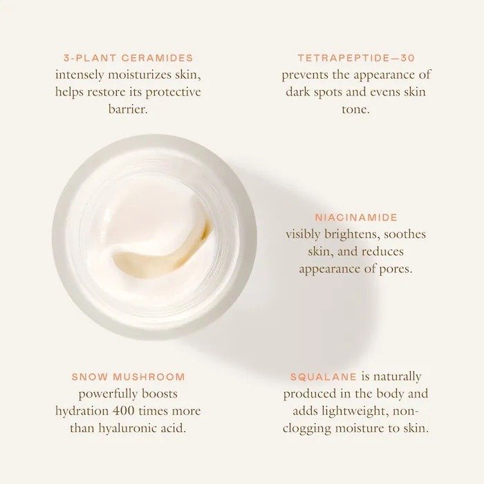 Qué es: Una crema hidratante ligera como una nube, pero ultra hidratante con péptidos, ceramidas y hongos de nieve para calmar rápidamente la barrera de la piel, mientras que rellena e ilumina visiblemente. Tipo de piel: normal, seca, mixta y grasa Preocupaciones para el cuidado de la piel: manchas oscuras, sequedad y enrojerecimiento