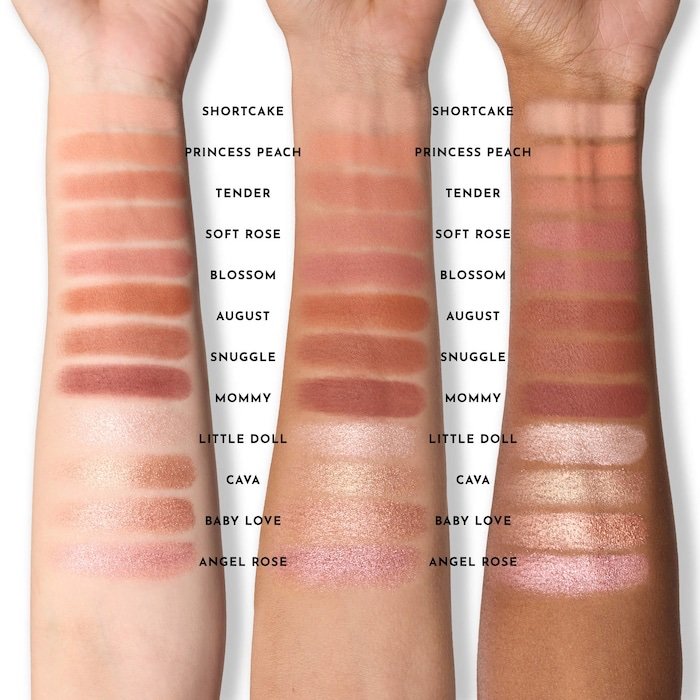 • 12 sombras de ojos de 1,2 g/0,423 oz en los tonos Shortcake (rosa pálido mate), Princess Peach (nude melocotón mate), Tender (rosa empolvado mate), Soft Rose (nude rosado mate), Blossom (malva mate), August (terracota mate), Snuggle (ciruela empolvado mate), Mommy (morado mate), Little Doll (cáscara metalizada), Cava (cobre rosado metalizado), Baby Love (mauvey gris topo metalizado) y Angel Rose (rosa rosa metalizado).