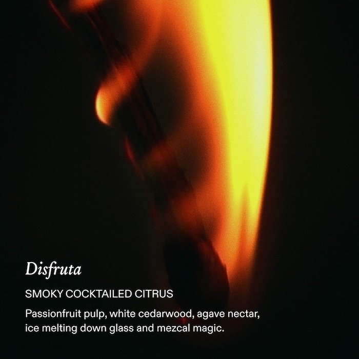Familia de fragancias: Terrosa y amaderadaTipo de aroma: Cítrico y amaderadoNotas clave: Pulpa de maracuyá, cedro blanco, mezcalDescripción de la fragancia: Disfruta es un cóctel cítrico ahumado, con notas de salida extáticas de pulpa de maracuyá y neroli, y un corazón cálido de mezcal y cedro blanco. Su final es como el de un cóctel artesanal, envolviéndote en una ráfaga de frío chispeante, como si el hielo se derritiera en un vaso.