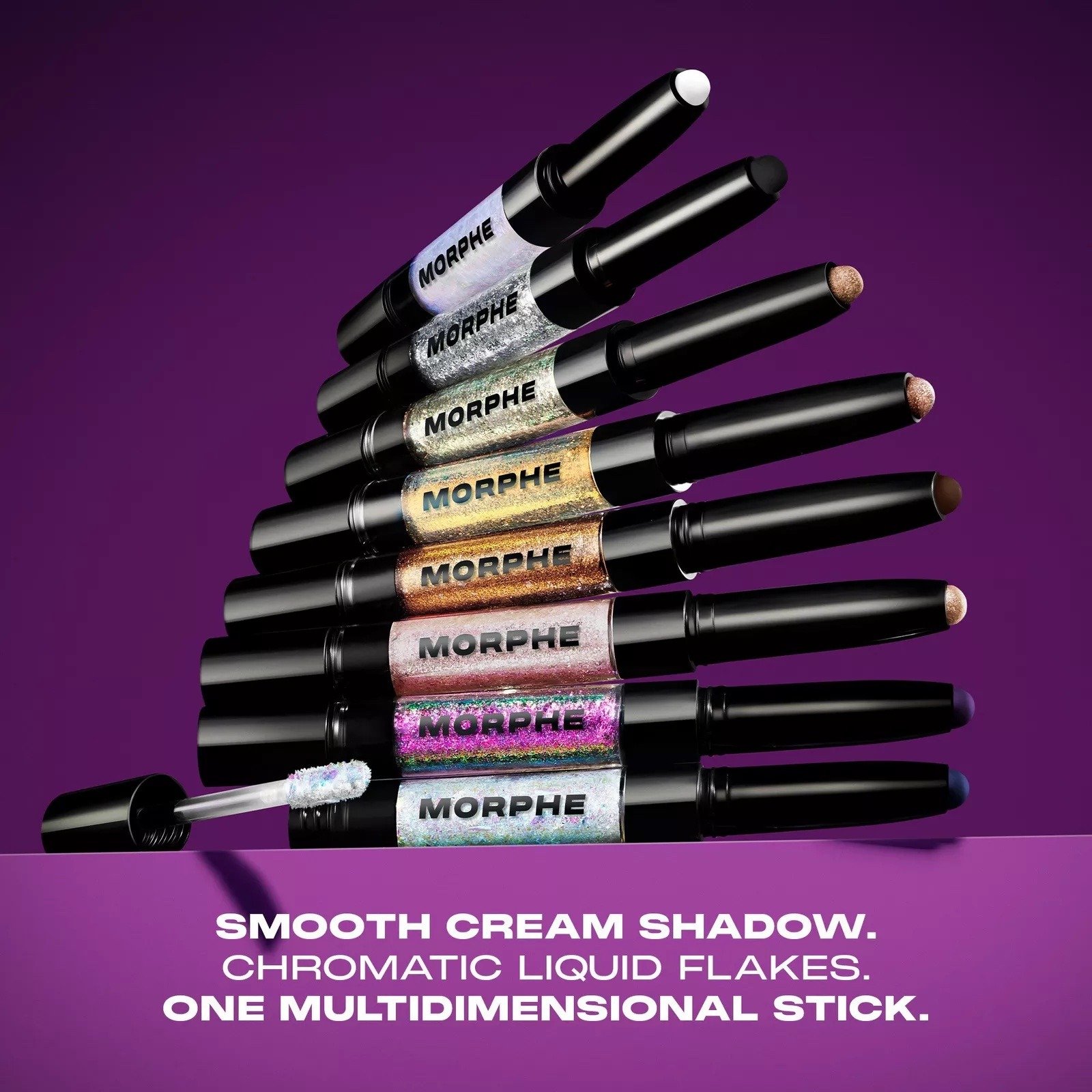 ¿Qué mensajes estás enviando? Muestra cada lado de cómo te sientes con el innovador Mixed Signals Dual-Finish Cream & Liquid Shadow Stick de Morphe. Desliza el dedo sobre la sombra cremosa de alto pigmento para un impacto instantáneo, luego aplica las escamas de sombra líquidas de cromo para una dimensión multifacética.