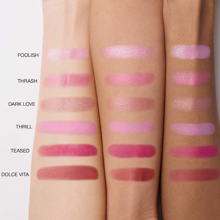 • 6 tonos de 3 g en FOOLISH (Rosa claro frío brillante), THRASH (Rosa frambuesa brillante), DARK LOVE (Rosa polvoriento brillante), THRILL (Rosa claro frío mate), TEASED (Fucsia mate) y DOLCE VITA (Rosa polvoriento mate)