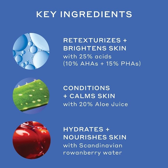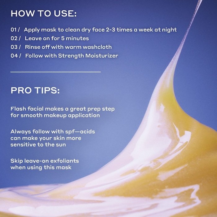 Qué es: Una mascarilla facial potente, repleta de un 25 % de AHA y PHA, que retexturiza para iluminar visiblemente, disminuir las líneas finas, arrugas y poros, y mejorar la claridad de la piel en solo cinco minutos. Tamaño: 50 mL