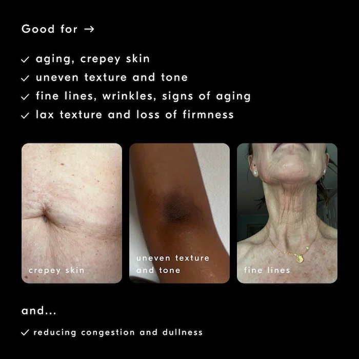 Qué es: Un suero corporal con retinol que estimula la renovación celular de la piel, mejorando la apariencia de líneas finas, opacidad, textura flácida y signos de envejecimiento. Tamaño: 75ml