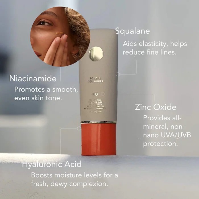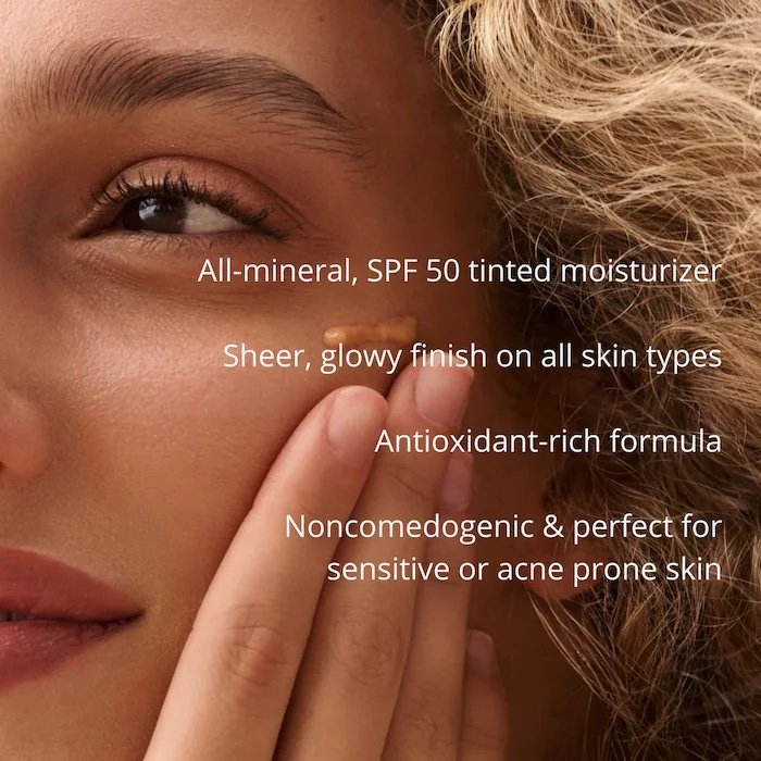 Qué es: Un protector solar mineral hidratante con color, con vitamina C, ácido hialurónico, niacinamida y mica para un acabado radiante en todos los tonos de piel. Tamaño: 40ml