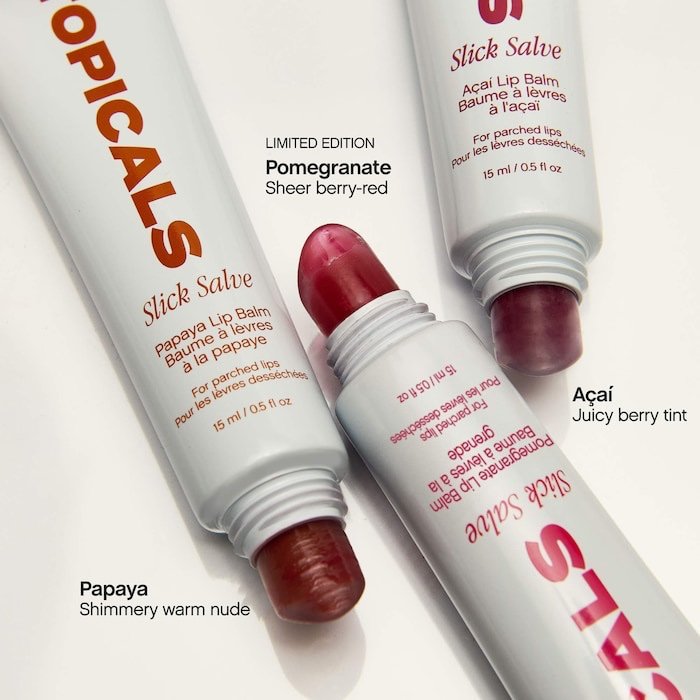 • 3 bálsamos labiales Slick Salve de 15 ml (0.5 oz) en açaí, granada y papaya